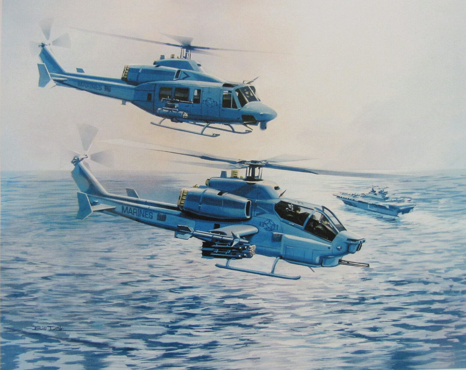 Presenting a striking naval aviation print by Bill Dale, showcasing two helicopters flying in tandem over open ocean as a naval warship quietly sails below. The scene captures the dynamic interplay of sea and air — helicopters poised in formation, with the strength and presence of the ship beneath them — symbolizing modern naval power and aerial support at sea.