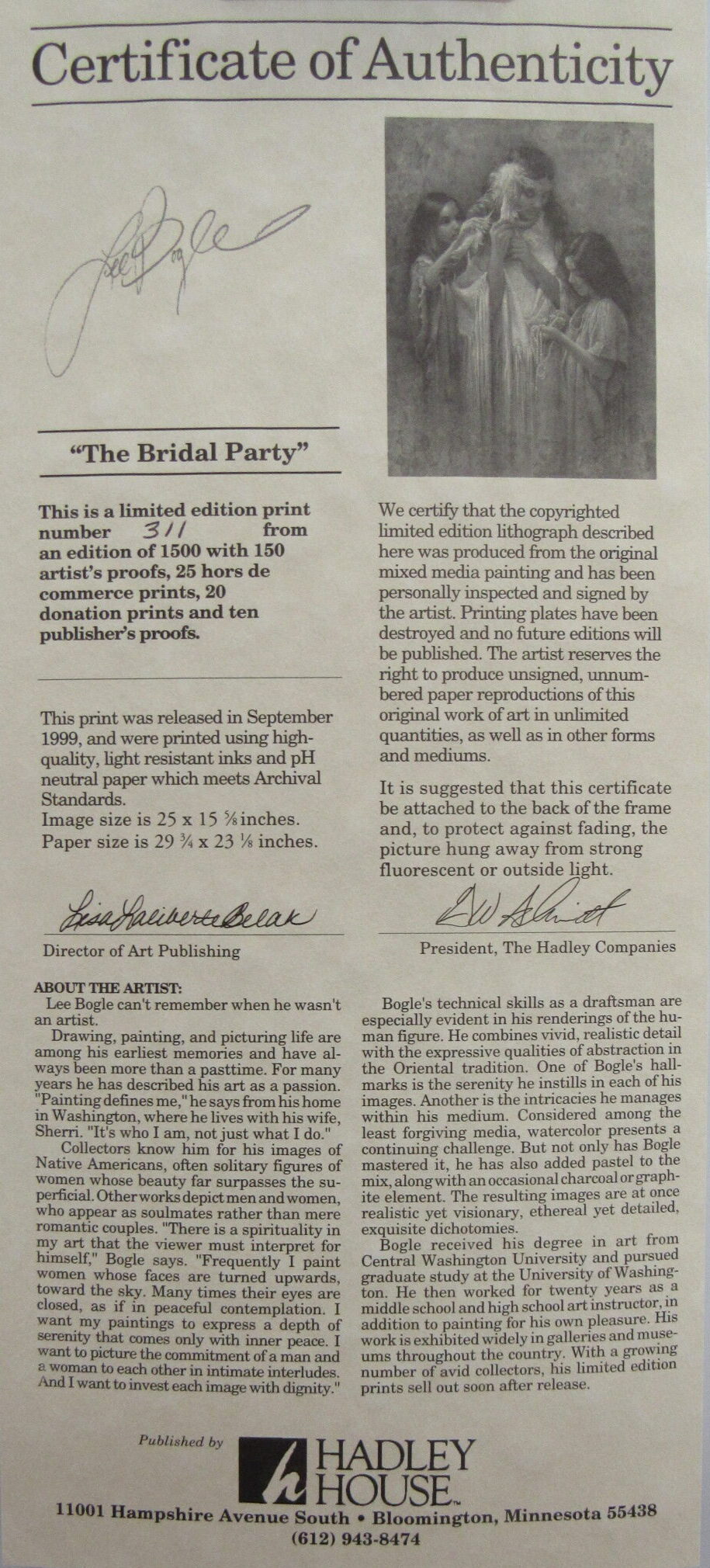 Add elegance and culture to your collection with “Bridal Party” by celebrated artist Lee Bogle. This limited-edition print (#311/1500) is signed by the artist and includes a certificate of authenticity. The piece captures Bogle’s signature grace and beauty — a stunning example of his Native American-inspired art. Gloss finish, excellent condition, and ready to frame!