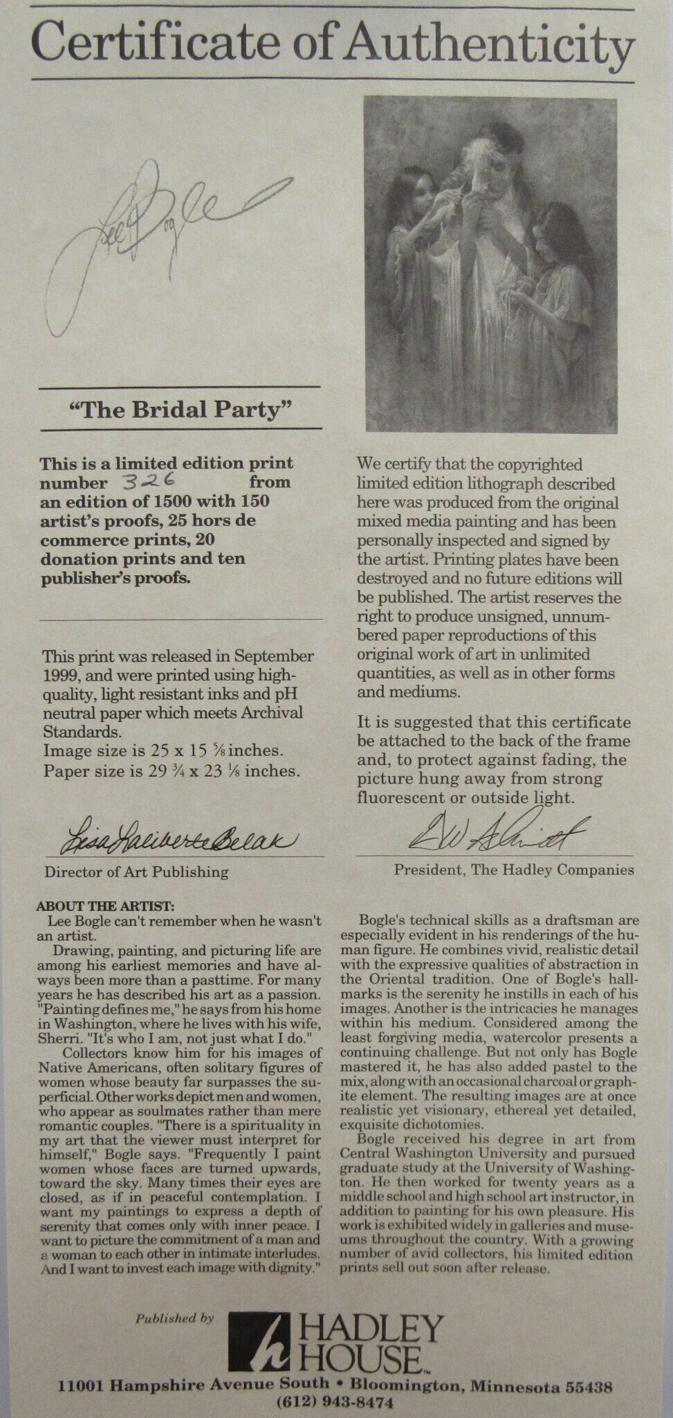 Celebrate Native American beauty and heritage with Lee Bogle’s “Bridal Party.” This signed, limited edition print (#326/1500) comes with a certificate of authenticity and showcases Bogle’s mastery of light and emotion. Printed on glossy, high-quality stock, this collectible artwork is in excellent condition — ready to be framed and admired.