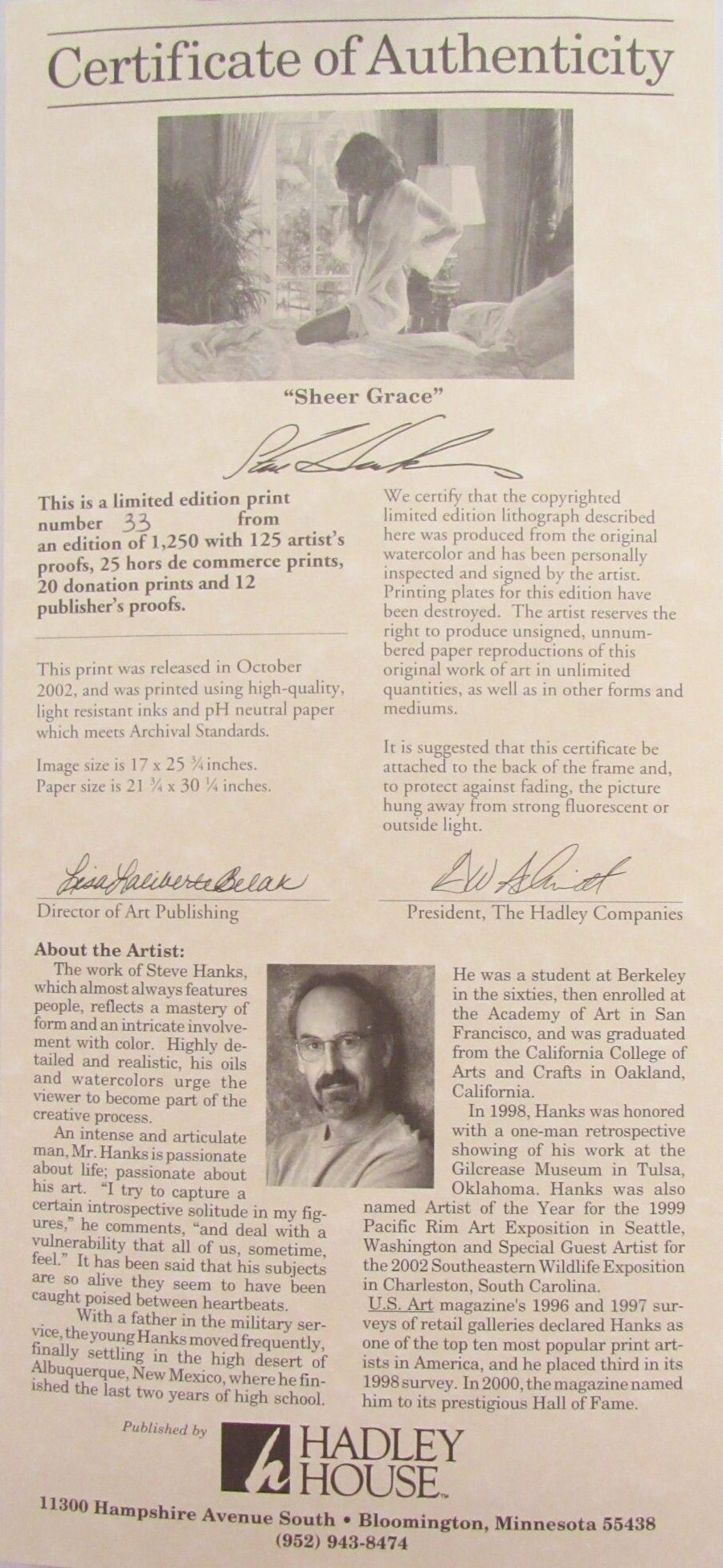 “Sheer Grace” by Steve Hanks – Signed Limited Edition Glossy Art Print 33/1250 with Certificate – Emotional Realism Watercolor