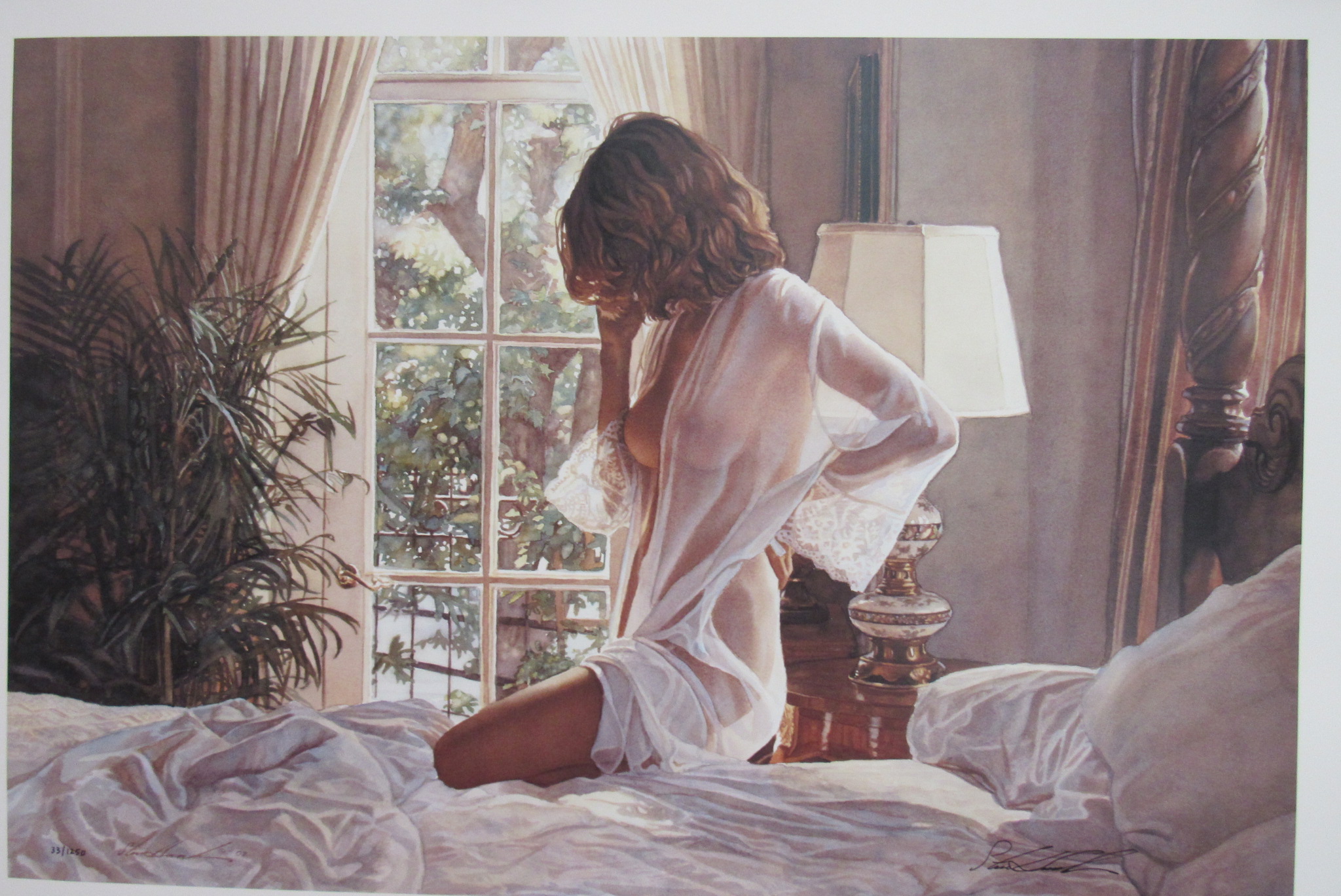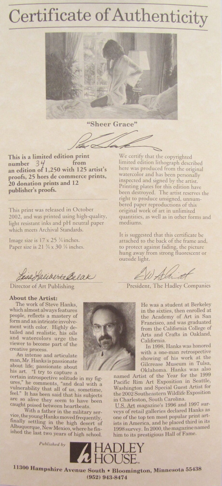 “Sheer Grace” by Steve Hanks is a signed, limited-edition print with a certificate of authenticity, showcasing Hanks’ renowned mastery of emotional realism. Printed on premium glossy cardstock, the piece emphasizes delicate light, intimate human expression, and exquisite watercolor detail. With its edition number 33/1,250, this collectible is ideal for art enthusiasts and Hanks’ fans looking to enhance their curated collection.